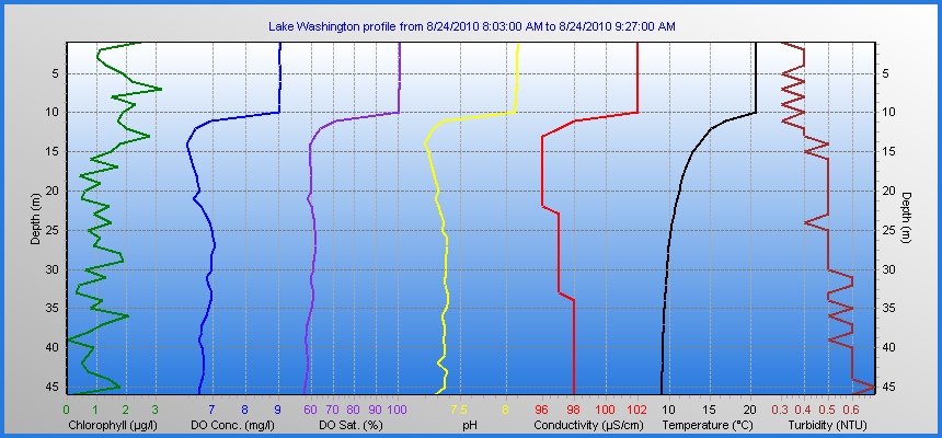 Relatively warm water is found in some of the large Puget Sound lakes. Take Lake Washington. After a warmer summer period the surface temperature can get into the low 70s. But beware, very cold water is below. Want to see proof? Here are some vertical distributions of temperature (black line) and other parameters from a buoy on Lake Washington. Warm near the surface (20C is 68F) , but head down more than 10 meters (roughly 30 ft) and it gets very cold, very fast.