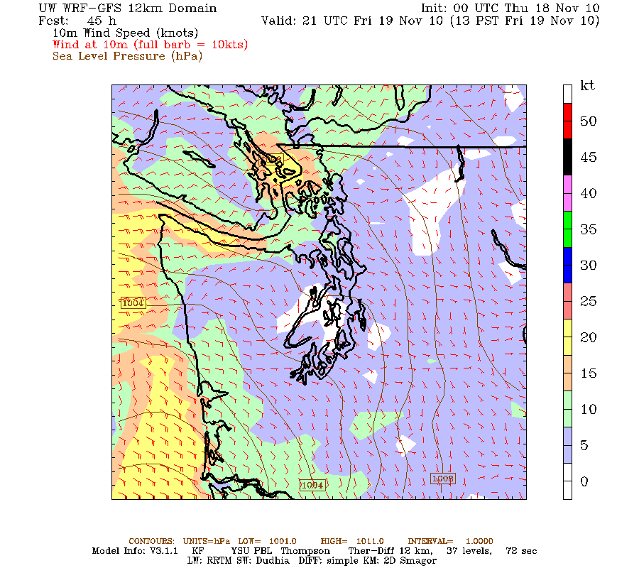 The big Kahuna goes first..the cold wave. Arctic air will first start leaking into the area on Friday through the Fraser and other gaps and then push southward over the region late Sunday. Here are a few images of the model output for Friday afternoon and Saturday am showing near surface winds, and the surging air from the interior of BC. They are going to be strong! Heading over the northern San Juans, into Vancouver Is and then southward towards the Strait.